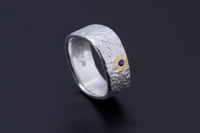 Eisschlagring Antikeck mit Saphier in Schneesilber 935 mit Gelbgold 917.