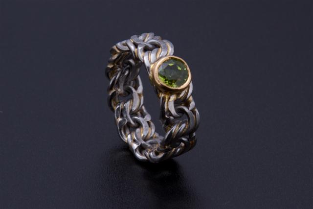 [slider]Garibaldiring mit Peridot auch Olivian genannt in Palladium 500 und Gelbgold 917.