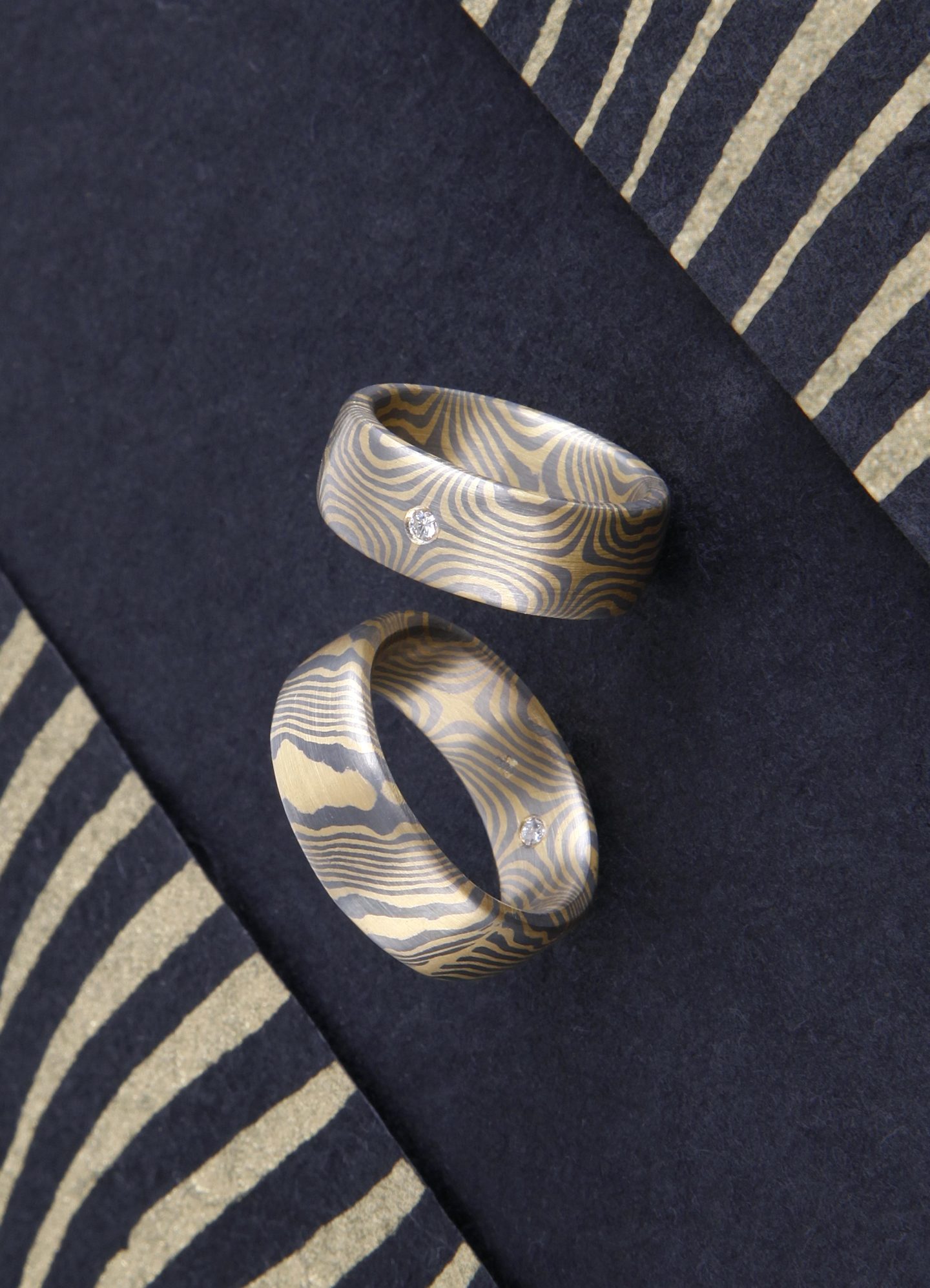 Mokume Gane Ringe eineinhalbfach Damasziert mit 6 Sternen innen und außen 3 Sterne, gegenüberliegend sind Schlangenlinien. Diedse Trauringe sind aus Gelbgold 917 und Palladium 500, zudem wurde ein Brillant 0,03 ct eingefaßt.
