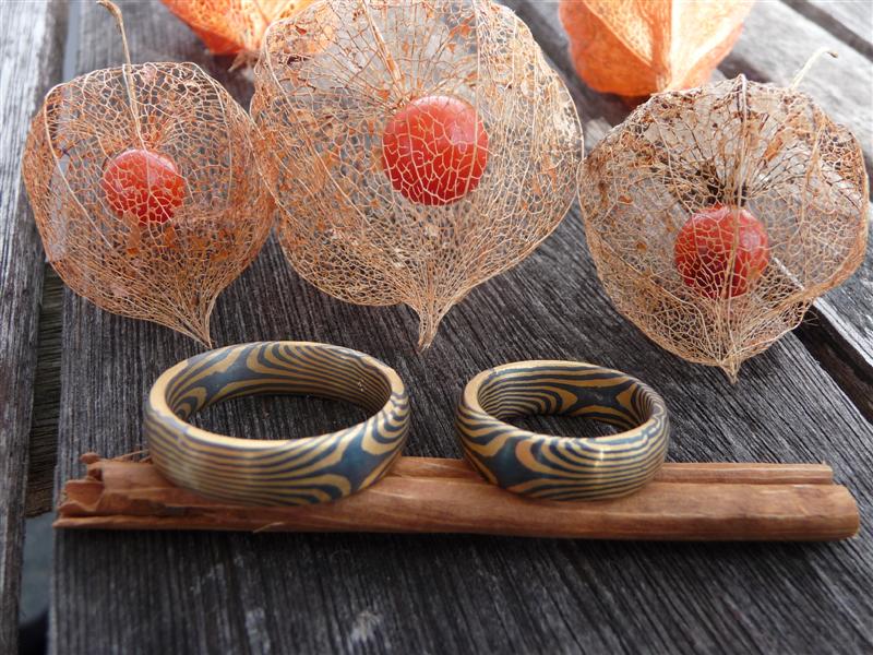Diese eineinhalb damaszierten Mokume Gane Ringe sind in Gelbgold 917 und Palladium 375 geschmiedet worden.