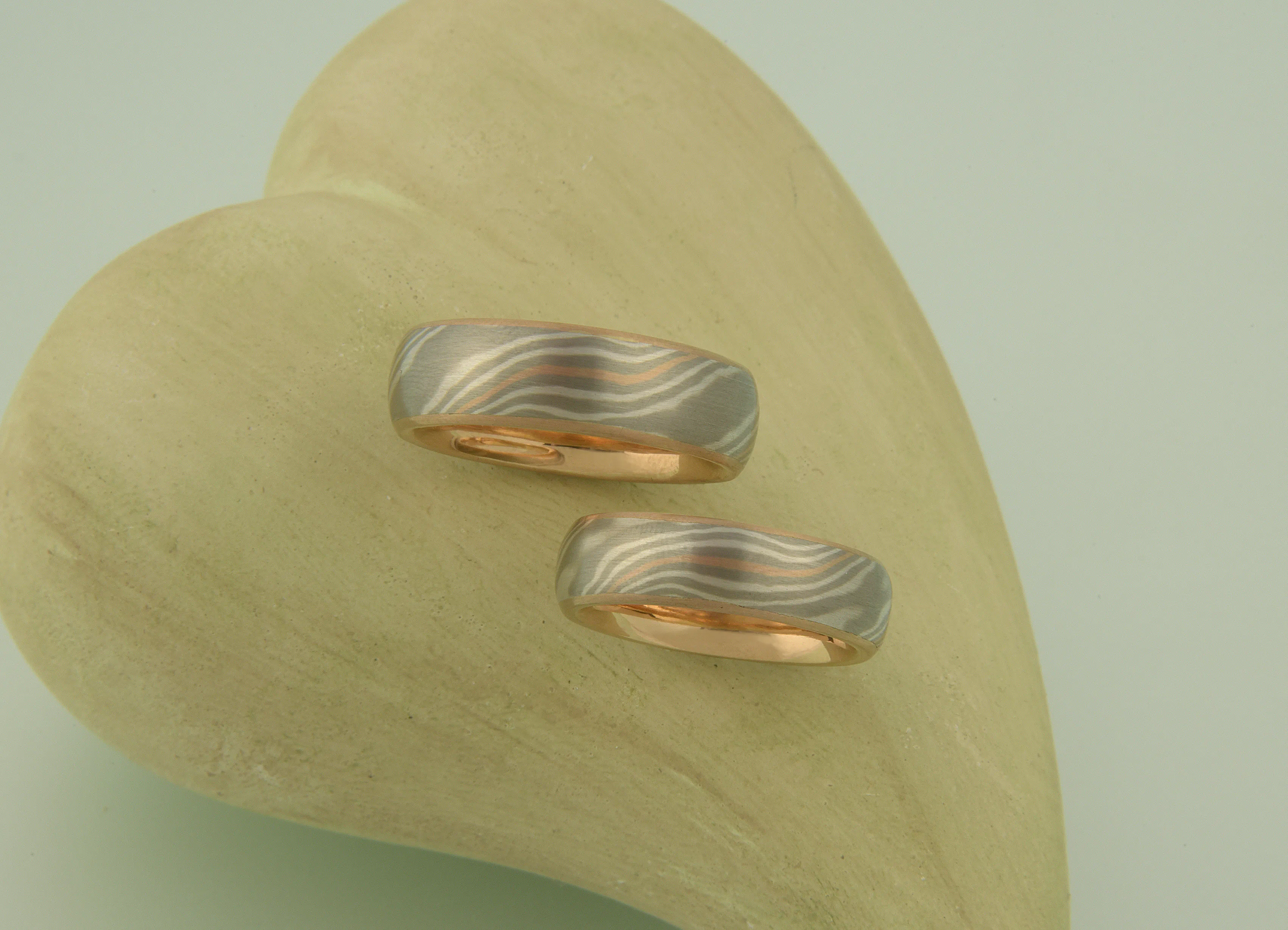 Diese Mokume Gane Ringe sind in Palladium, Rotgold und Schneesilber geschmiedet und es wude ein innenring aus Rotgold eingearbeitet.