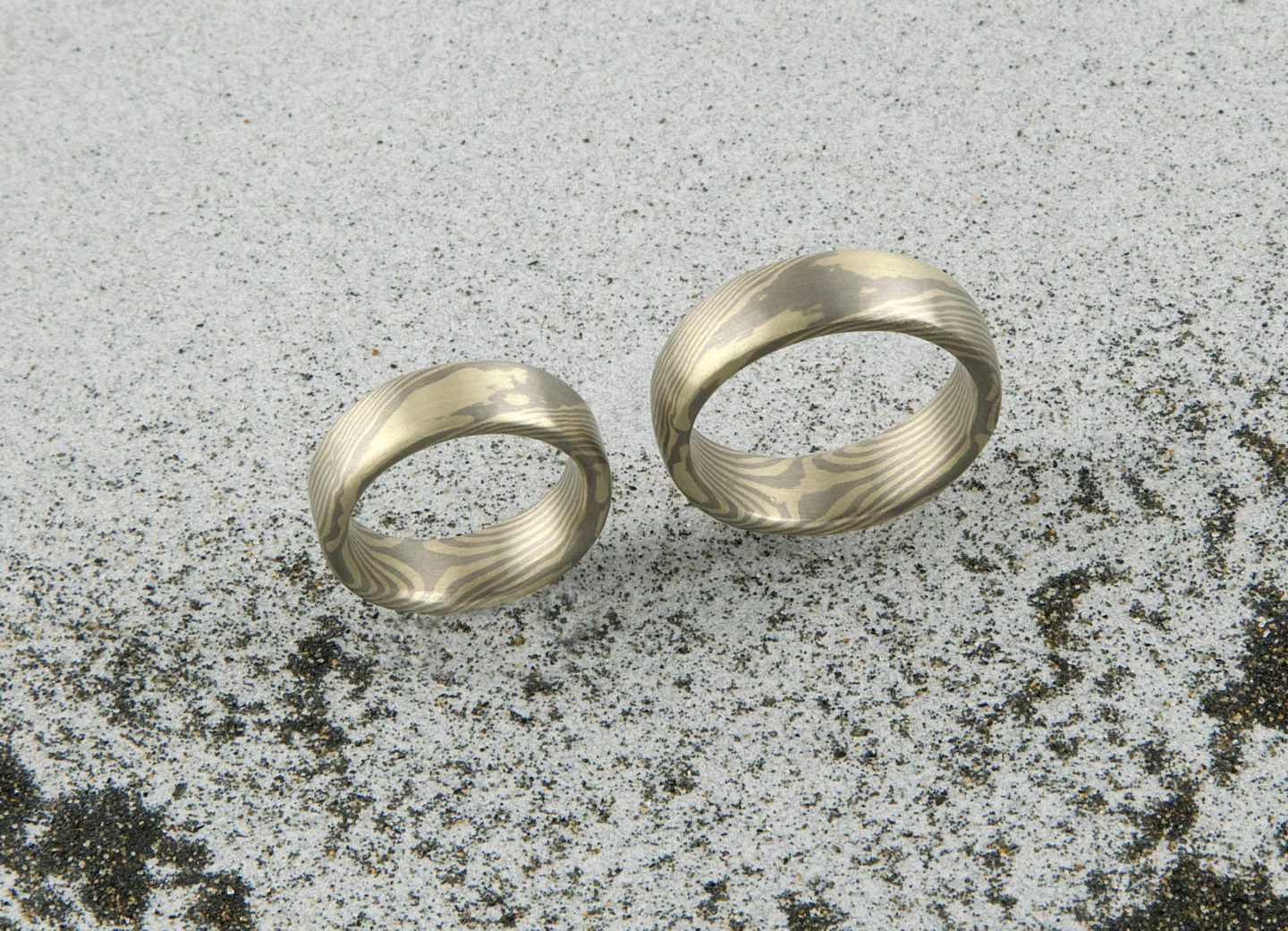 Mokume Gane Ringe mit zwei Sternen innen in Grüngold 585 und Palladium 375.