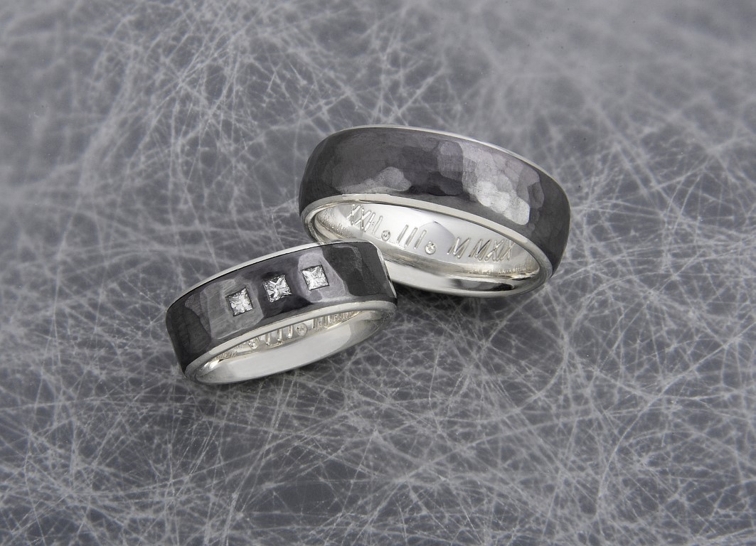 Schmiederinge aus Tantal mit Innenring aus schneesilber 935 und drei Diamanten Princess Cut.