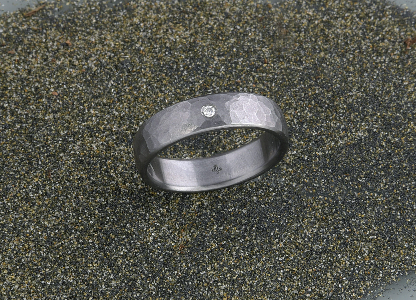 Bei diesemSchmiedering wurde in Tantal ein Brillant eingearbeitet.
