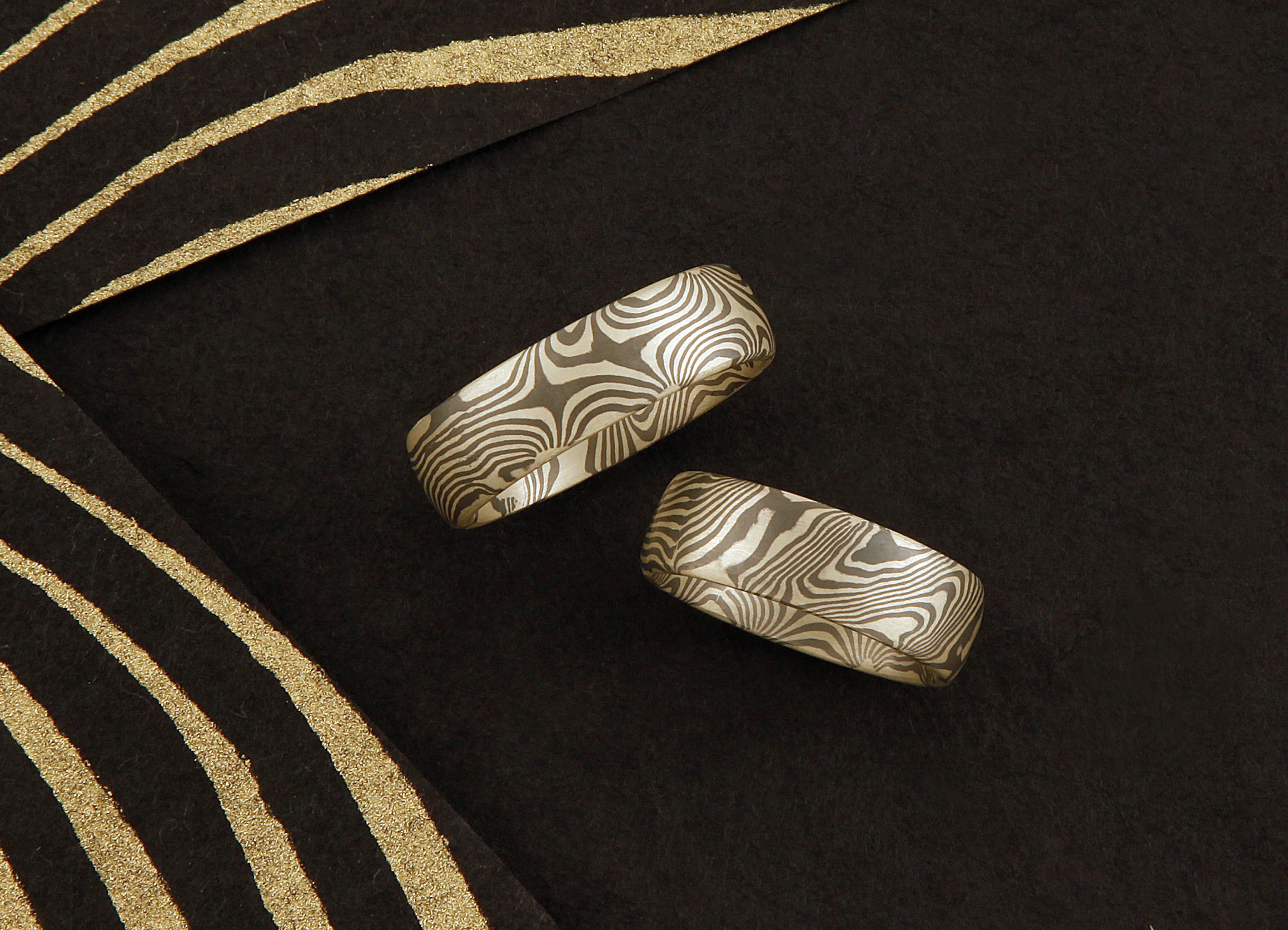 Zwillingsdamastringe in Grüngold 646 und Palladium 500.