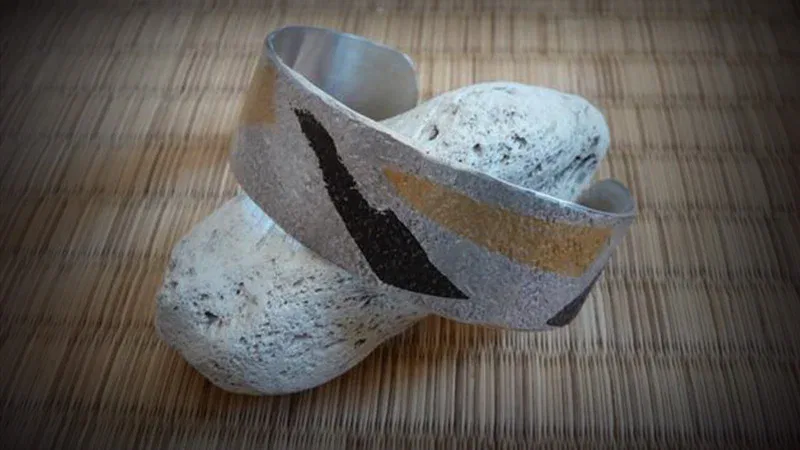 In römischer Zeit war die „Korinthische Bronze“ Inbegriff des sündhaften Luxus. Nach Plinius war dieses Material fast wertvoller als Gold. Und tatsächlich ist Gold neben Silber und Kupfer ein wichtiger Bestandteil dieser Legierung. Bei Hautkontakt bildet sie sich auch nach Beschädigung immer wieder von selbst nach. Da das Material mit unserem Hautschweiß reagiert, ändert sich die Farbe stetig und ist abhängig von Person und Jahreszeit.